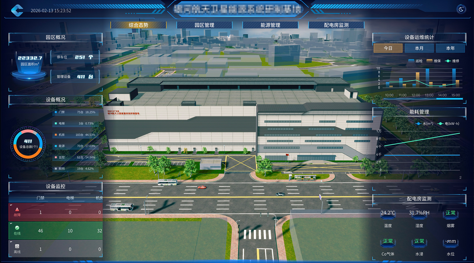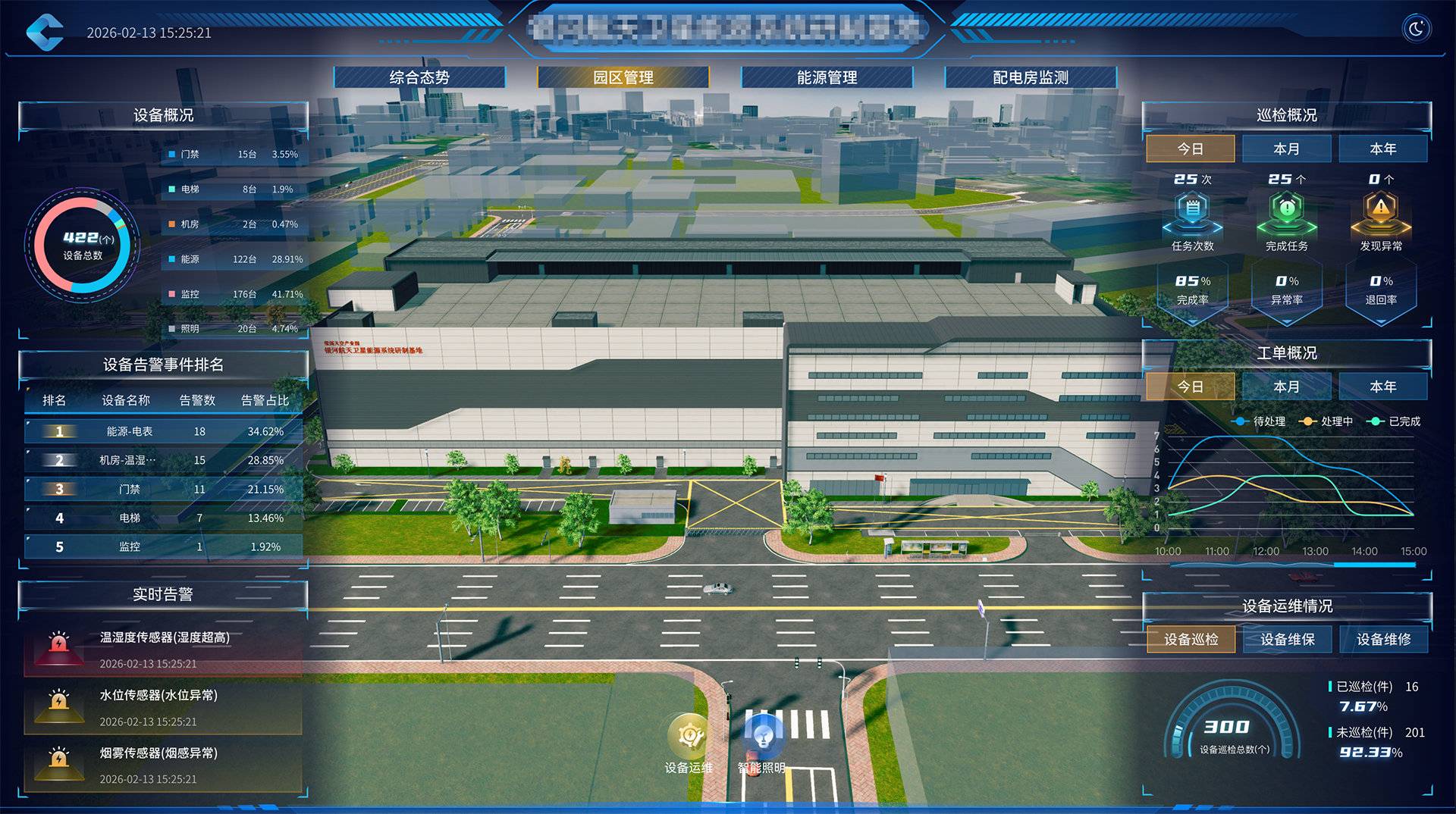 3D 大屏模块以可视化形式实时呈现基地综合态势、园区管理、能源消耗、配电监测等核心数据,通过多维度图表与动态展示,为管理者提供直观的决策依据;管理后台涵盖园区管理、设备管理、设备监测、告警管理、能源管理、场景联动、运维服务等 13 大核心模块,实现从项目建档、设备全生命周期管理到能耗分析、工单流转的全流程数字化管控,其中设备管理模块支持产品分类、厂商管理、备品备件统筹等精细化操作,能源管理模块可完成水电气消耗的多维度统计与节能分析;移动小程序则聚焦一线运维场景,实现巡检任务派发、保养计划执行、故障上报、告警处理等移动端操作,配合视频监控、门禁系统、电梯系统等实时监测功能,让运维工作突破空间限制,提升响应效率。